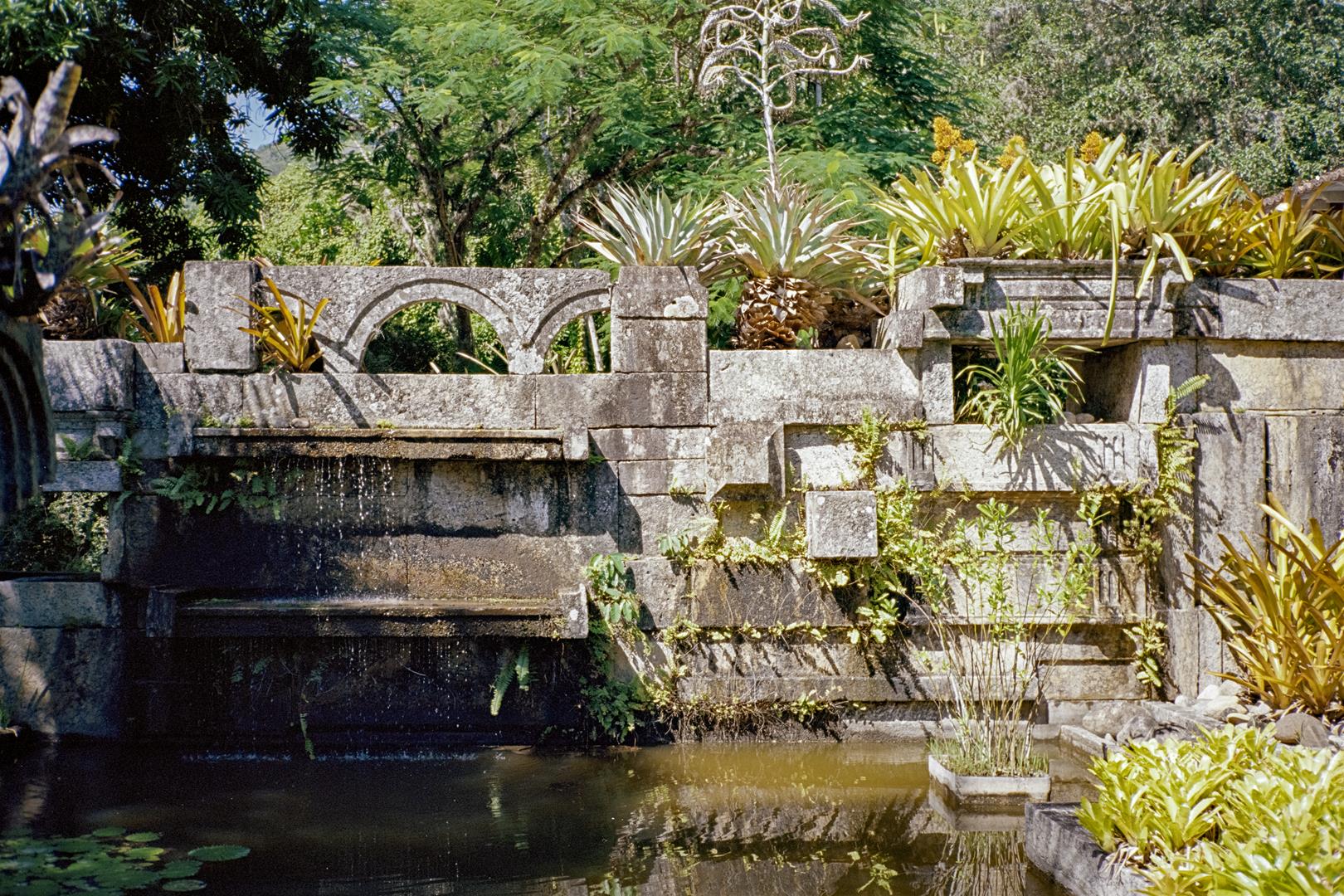 Vista de painel de pedras de cantaria localizado em frente à varanda da casa principal
